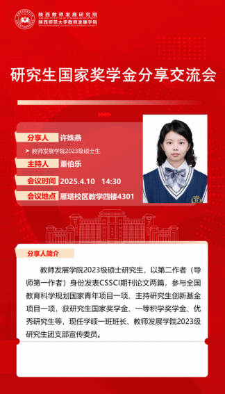 本次分享交流会邀请麻豆在线 2024年国家奖学金获得者,2023级教育经济与管理专业硕士生许姝燕同学进行经验分享。