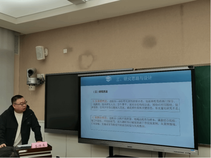 会上,董军、范楷、高倩、吴滑四位项目负责人依次对《师范院校思政教育与专业教育深度融合育人机制研究》《初中道德与法治教师项目式教学胜任力模型构建与实证研究》《统编初中道德与法治新教材分析与使用策略研究》《AI技术赋能高校思想政治工作的价值意蕴、风险挑战与实践路径研究》四个项目进行开题汇报。围绕项目的选题背景和意义、选题目的、研究内容、研究过程与方法以及论文的创新点等核心问题进行了全面阐述。