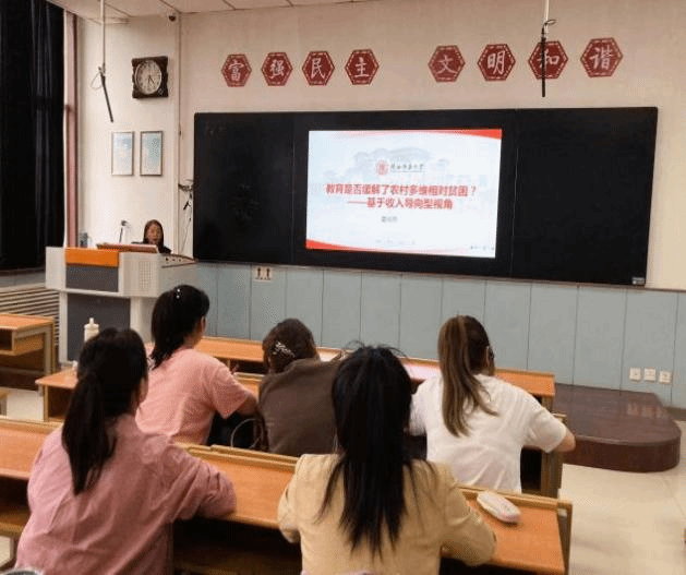 董俊燕围绕报告主题,她从问题提出、文献综述、问题分析、结论与对策建议这几个方面进行讲解,展示做研究的一般思路。她从经济学的视角去探析教育对于农村多维相对贫困的缓解作用,并提出了相应的对策建议。