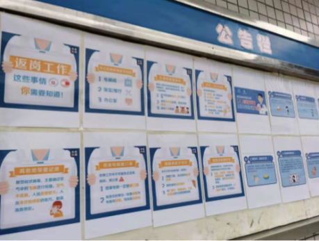 ▲在公告栏及显眼位置张贴宣传资料,提高员工防疫意识