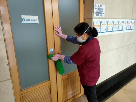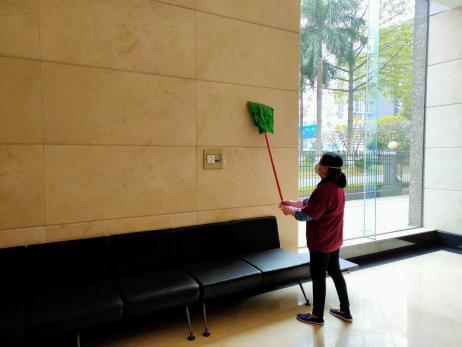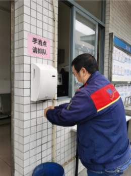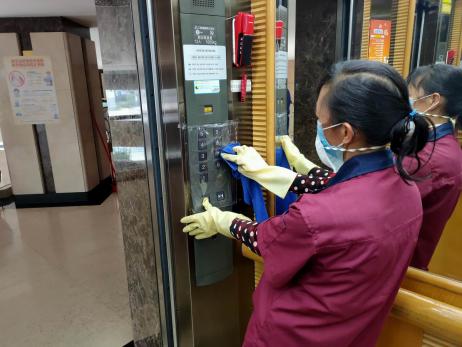 ▲电梯、门把手等人员常接触的地方消毒